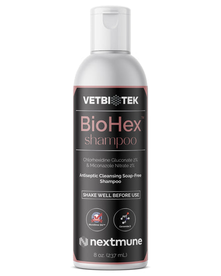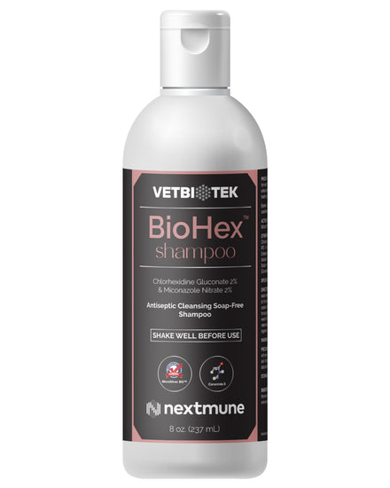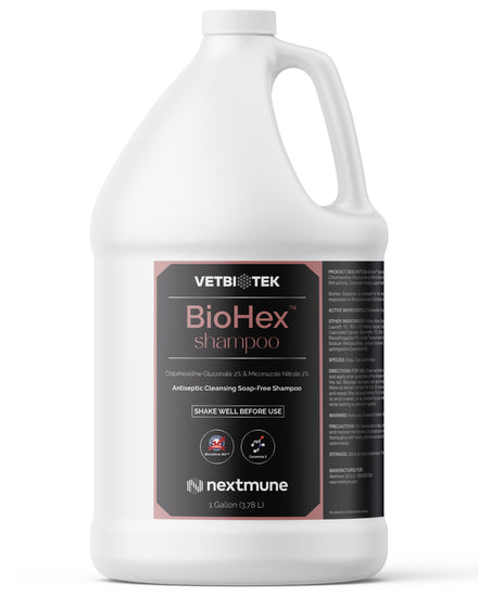 Biohex Shampoo is an antiseptic shampoo indicated to help in skin conditions responsive to chlorhexidine and miconazole. It is indicated for use in dogs, cats, and horses. Contains Microsilver as an antimicrobial and antibacterial agent.